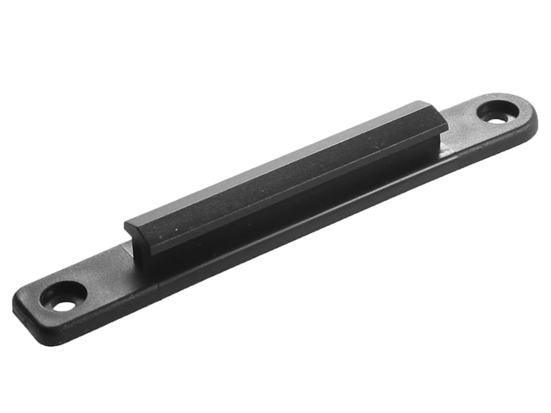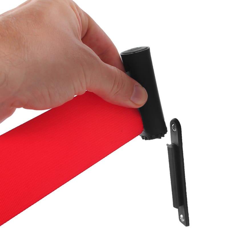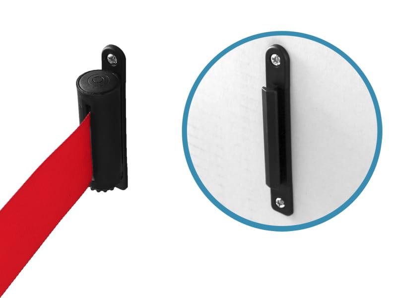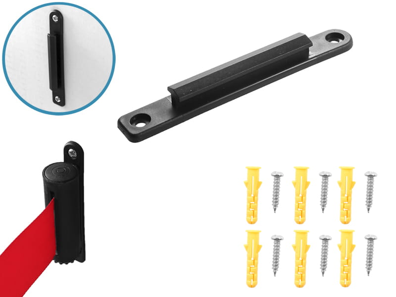 Tworząc system odgradzający czasem niezbędne jest dodatkowe zablokowanie przestrzeni między słupkiem hotelowym a ścianą. Wynika to najczęściej z układu pomieszczenia oraz preferencji - jeśli zależy nam by całość wygrodzenia prezentowała się niezwykle estetycznie i nie chcemy, by jeden ze słupków stał dosunięty do ściany. W takim przypadku niezbędnym elementem może być uchwyt ścienny, który pozwala zaczepić końcówkę taśmy odgradzającej. Wykonany jest z tworzywa sztucznego w kolorze czarnym i montaż odbywa się za pomocą kołków, dostępnych w zestawie, przez dwa otwory montażowe.